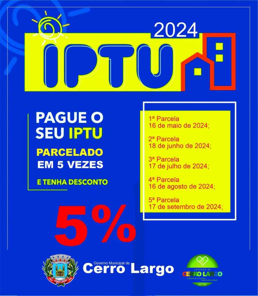 Se você contribuinte, não pagou seu IPTU 2024.em parcela única, com o desconto de 10%, até o 17 de abril de 2024, e optou pelo parcelamento, com desconto de 5% em cada parcela, não esqueça, você pode emitir as guias de pagamento no site do Governo Municipal www.cerrolargo.rs.gov.br , no link EMISSÂO IPTU , informando a matricula do IPTU ou CPF/CNPJ do titular, junto a Secretaria Municipal da Fazenda.