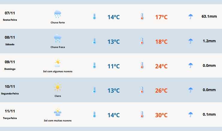 A chuva começa ainda na madrugada em algumas áreas e se espalha, podendo ocorrer até a manhã em todo o estado. Espera-se chuva forte, com volumes de 50 mm a 100 mm em 24 horas.