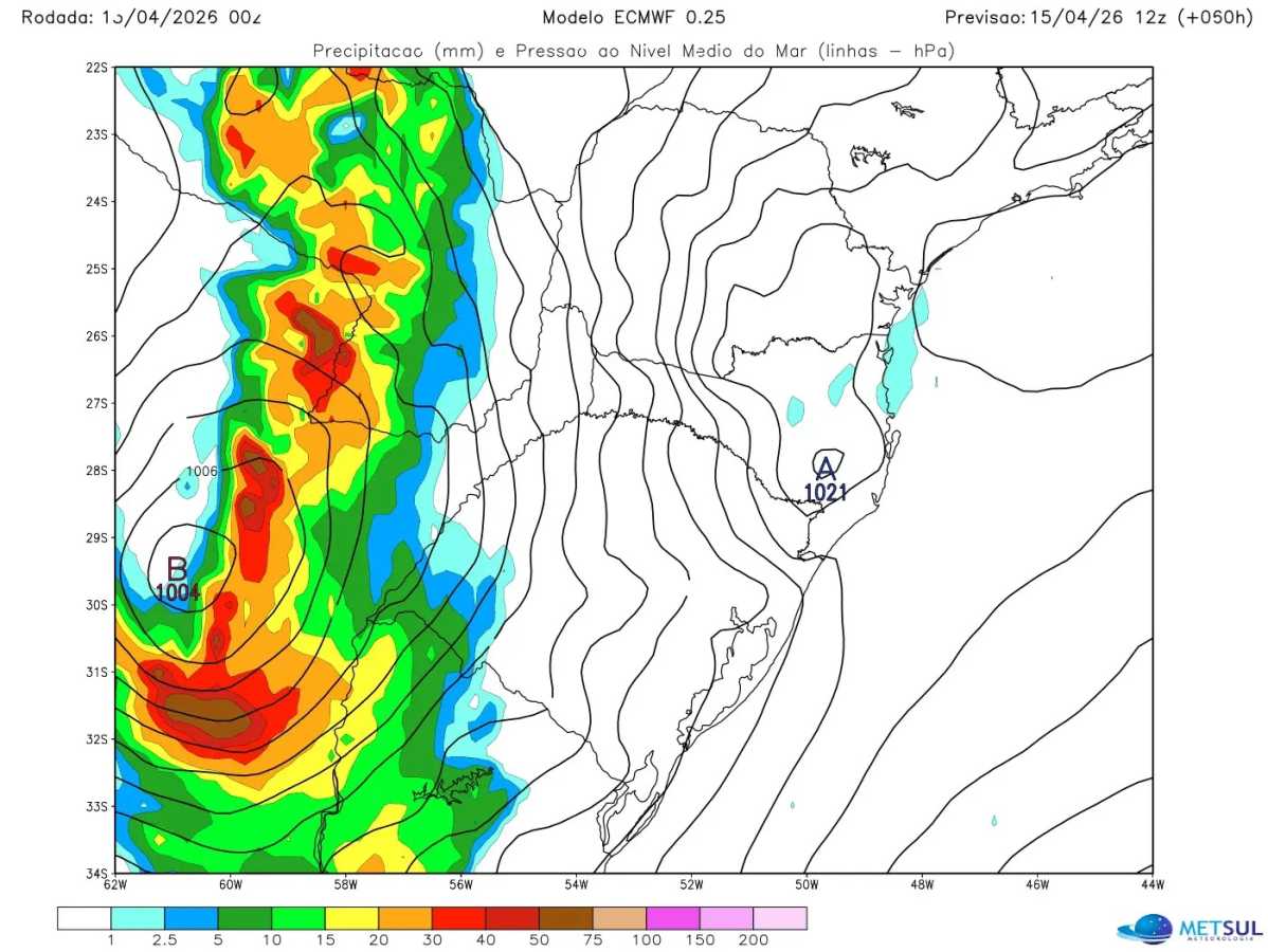 Uma área de baixa pressão vai atuar por vários dias seguidos nas latitudes médias da América do Sul com muita chuva e temporais, podendo dar origem a um novo ciclone extratropical no final da semana, prevê a MetSul Meteorologia.