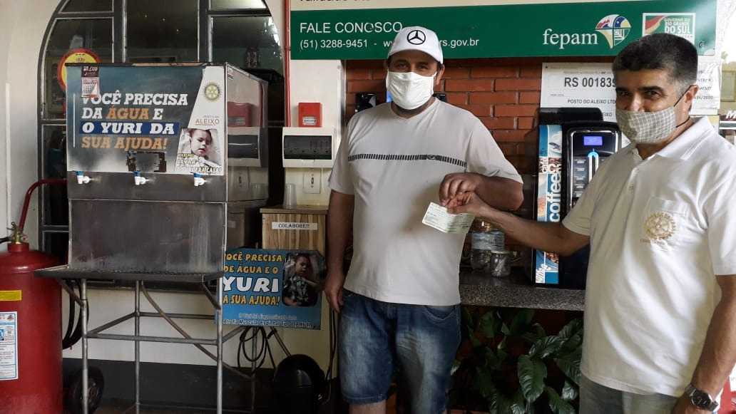Uma delas, que já acontece há alguns anos, é a urna localizada no Posto Aleixo, implementada pelo rotariano Carlinhos Giordani, na qual os clientes que se servem de água quente ou gelada são convidados a contribuir com uma quantia em dinheiro para o menino Yuri Schons, portador de Atrofia Muscular Espinhal tipo 1. Para cada real arrecadado, o Rotary Club entra com uma contrapartida de igual valor. Neste ano, foram arrecadados R$ 1.595,85, que somados ao valor pago pelo Rotary resultou em R$ 3.200,00, que foram entregues ao pai do Yuri, Ricardo Schons.