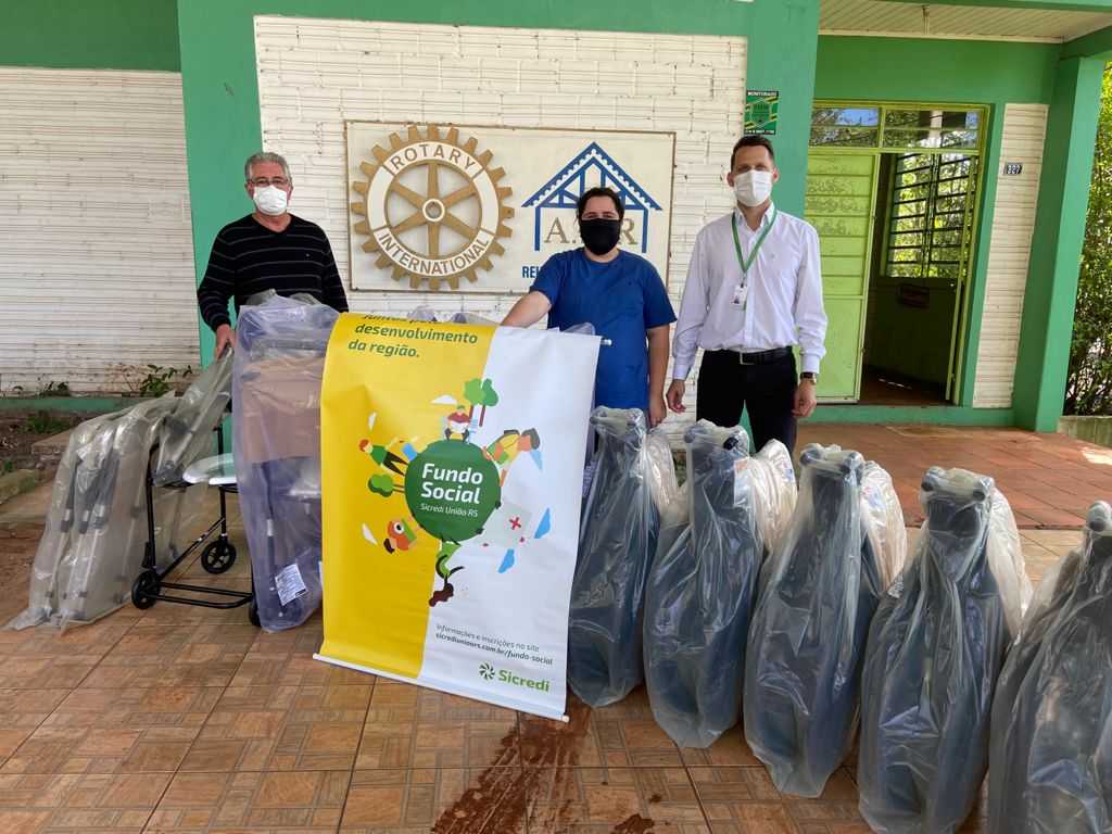A partir de valor destinado pelo Fundo Social da Sicredi União RS, o Rotary fez a aquisição de cinco cadeiras de rodas, cinco cadeiras de banho, cinco andadores articulados, duas muletas, duas muletas canadenses articuladas e duas muletas auxilares com apoio injetado.