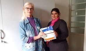 Na semana que passou a Casa da Amizade de Cerro Largo, por meio de sua presidente Maria Helena Theobald, fez a entrega de duas caixas de luvas para a Cooperativa de Trabalho de Catadores Unidos Pela Natureza (Coopercaun), que reúne os trabalhadores que atuam na coleta de materiais recicláveis no município, com sua sede localizada em Linha Primeira (junto à Central de Triagem de Resíduos Sólidos Urbanos).