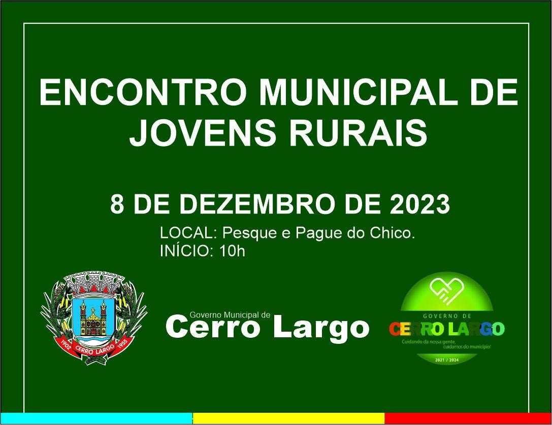 O Governo Municipal de Cerro Largo, por meo da Secretaria de Agricultura e Expansão Econômica e a Emater/RS-Ascar, em parceria com o Sindicato dos Trabalhadores Rurais, Sicredi e Cresol, comunicam que o Encontro Municipal de Jovens Rurais, que seria realizado na sexta-feira - dia 1° de dezembro, no Pesque e Pague do Chico, foi transferido para o dia 8 de dezembro de 2023, a partir das 10h.