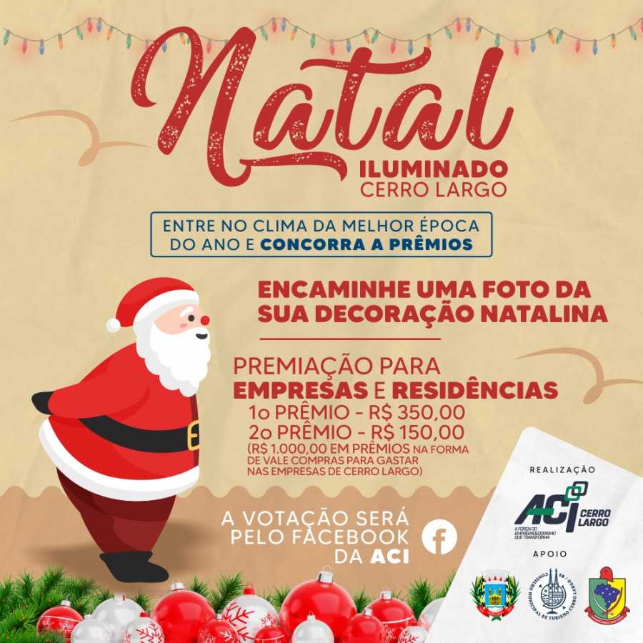 Numa realização da Associação Comercial, Industrial, Agroindustrial e de Serviços de Cerro Largo (ACI), com apoio da Prefeitura Municipal, Comtur e Poder Legislativo, a campanha Natal Iluminado tem o objetivo de que a cidade entre em clima de Natal, embelezando ainda mais casas e empresas.