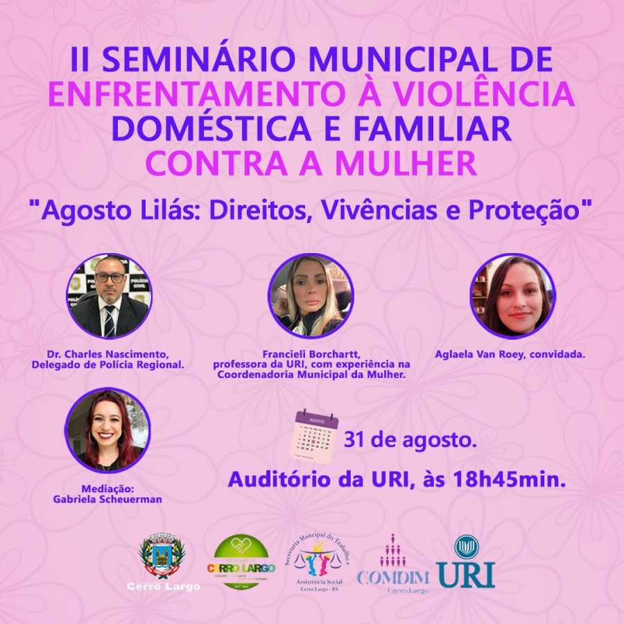 Dessa forma, será realizada a Roda de Conversa Agosto Lilás: Direitos, Vivências e Proteção, com a participação do delegado regional de Policia, Charles Dias do Nascimento, da mestra Francieli Borchard e da convidada Aglaela Vanroy, com mediação da professora e coordenadora do Curso de Direito da URI, Gabriela Scheuerman.