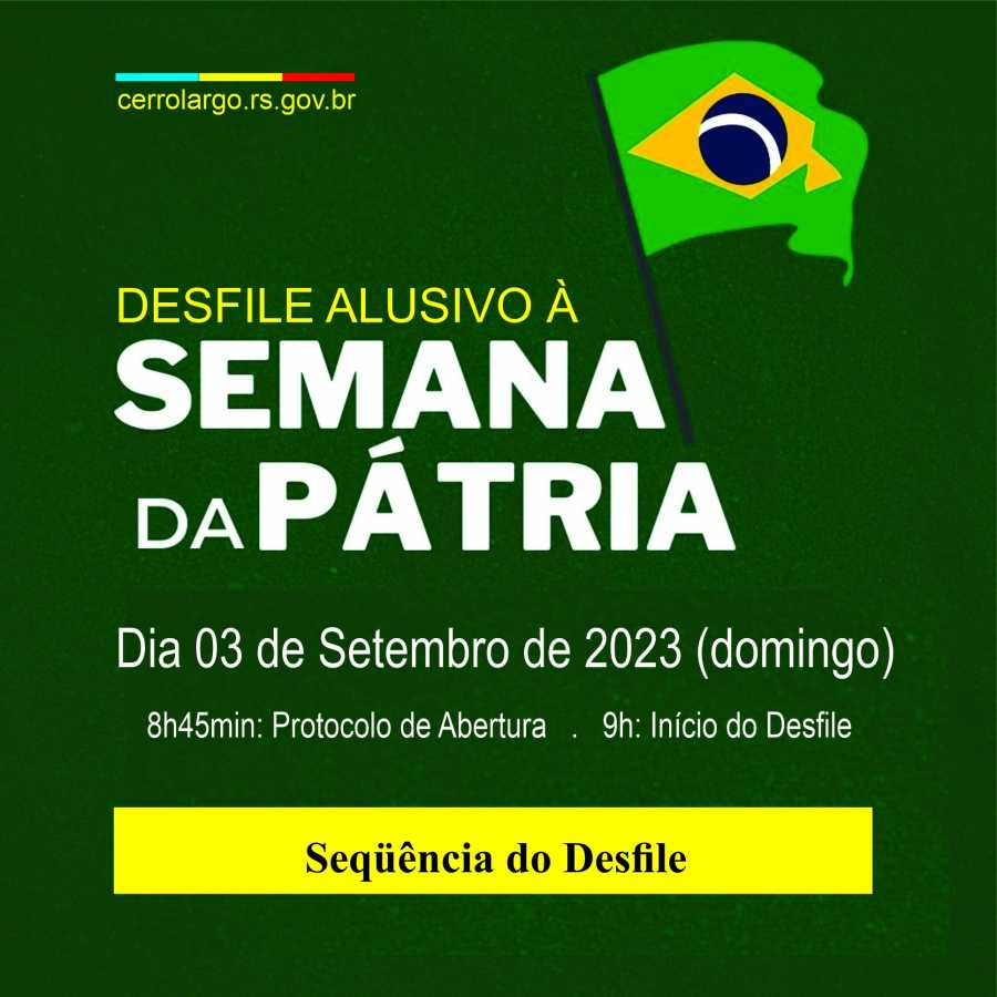 O tradicional desfile alusivo à Semana da Pátria será realizado neste domingo, dia 3 de setembro de 2023, na Rua Coronel Jorge Frantz, com início às 9h.