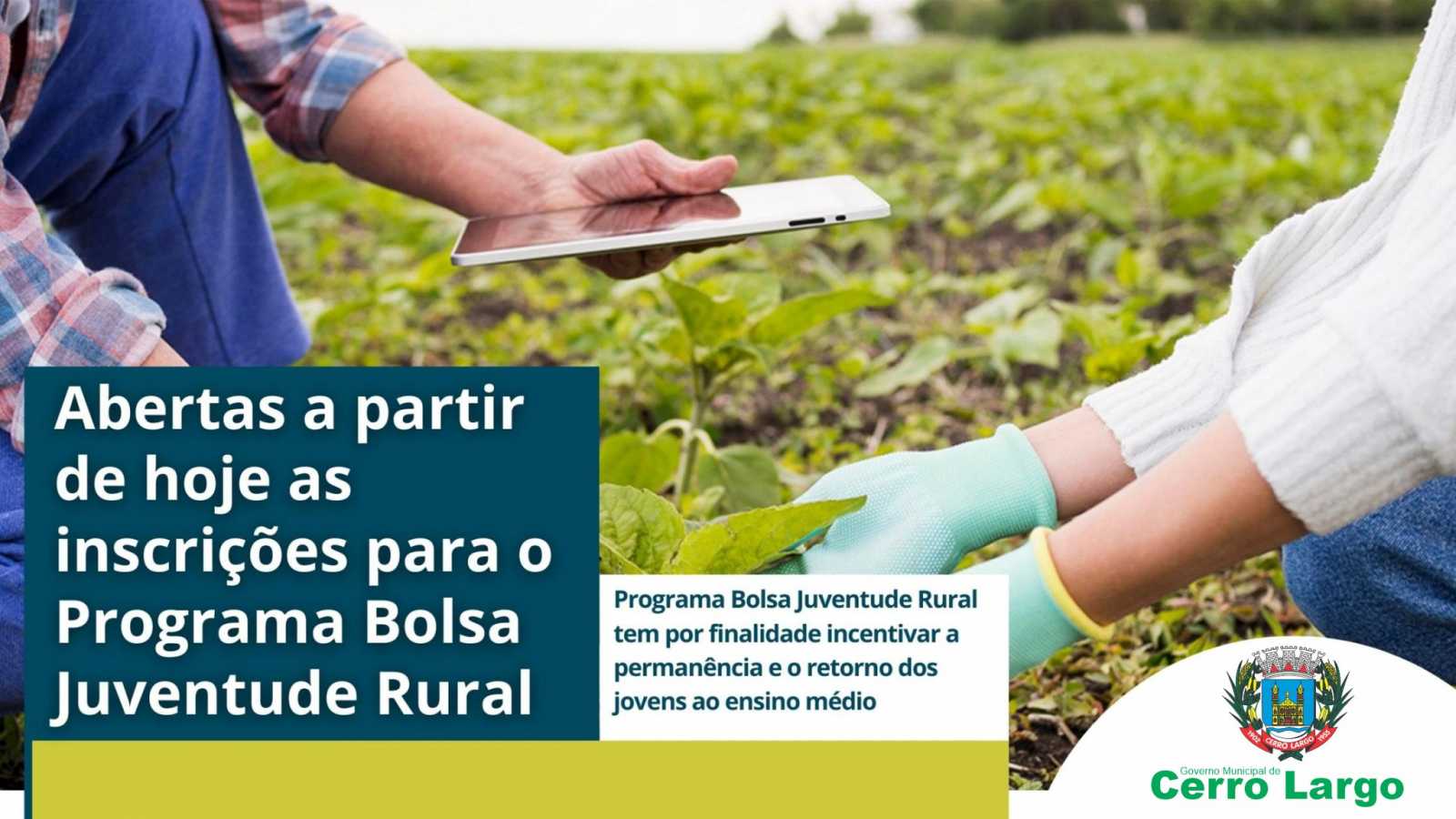O Governo Municipal de Cerro Largo, por meio da Secretaria da Agricultura e Expansão Econômica, informa que estão abertas as inscrições para o programa Bolsa Juventude Rural, voltado para jovens estudantes do Ensino Médio, que têm entre 15 e 29 anos.