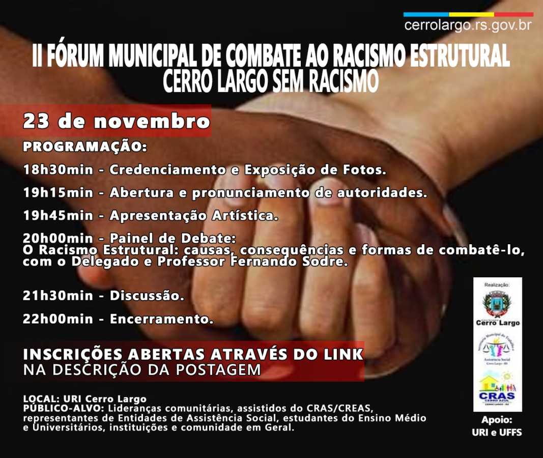 Será nesta quarta-feira (23/11), o 2º Fórum Municipal de Combate ao Racismo Estrutural, que faz parte da campanha Cerro Largo Sem Racismo, coordenada pelo Governo Municipal de Cerro Largo, por meio da Secretaria do Trabalho e Assistência Social, em parceria com a Universidade Integral do Alto Uruguai e das Missões (URI) e a Universidade Federal da Fronteira Sul (UFFS), ambas com campus no município.