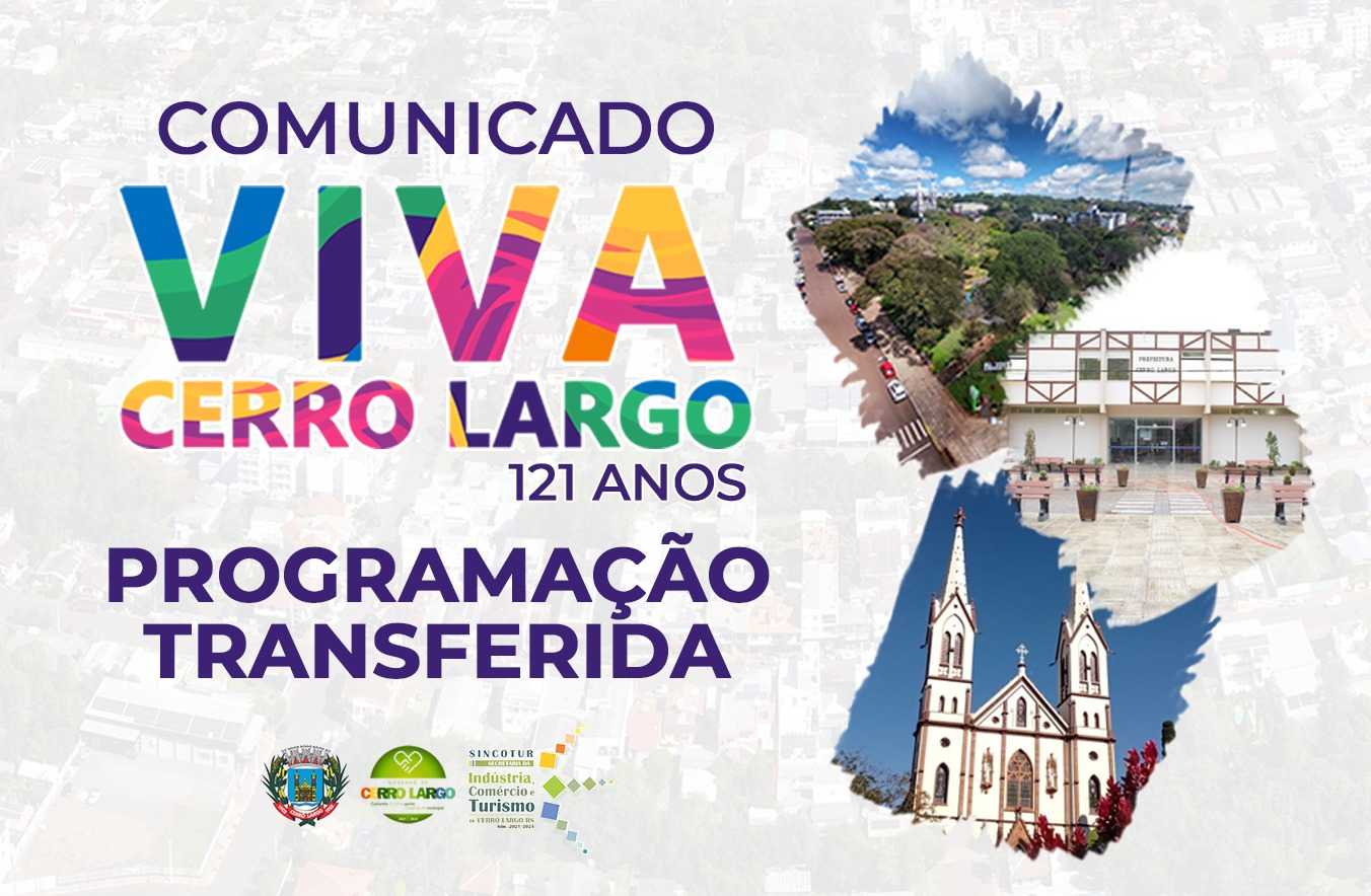 O Governo Municipal de Cerro Largo e o Sicredi União RS/ES informam que, devido às condições climáticas previstas pelo Climatempo, UFFS e outros, que alerta quanto à instabilidade do tempo, com previsão de fortes chuvas durante esta sexta-feira (6/10), está transferido o evento em comemoração aos 121 anos de fundação do Município de Cerro Largo, e os 110 anos do Sicredi, que conta com show da dupla Léo & Cauhã, da turnê Destinos do Cooperativismo.
