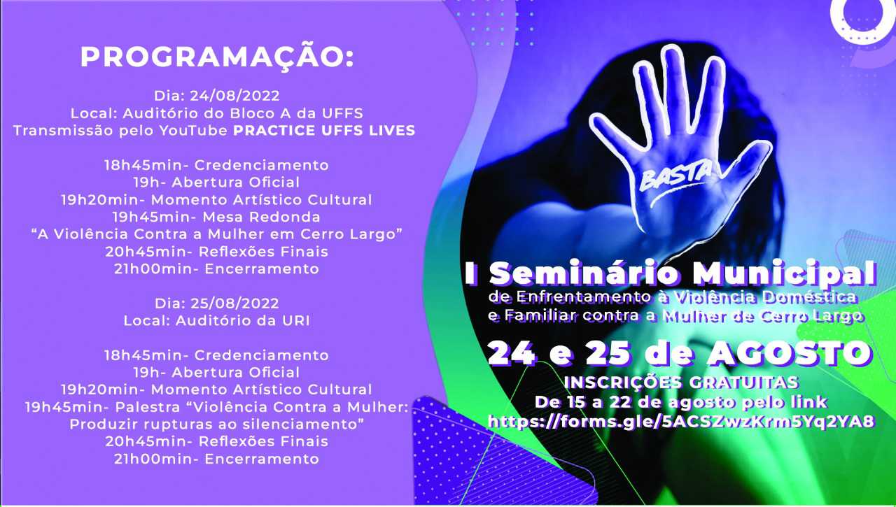 Alusivo à campanha Agosto Lilás, que objetiva a disseminação de informações e a sensibilização da população frente ao combate à violência de gênero, o 1º Seminário Municipal de Enfrentamento à Violência Doméstica e Familiar Contra a Mulher é um evento promovido pela Governo Municipal de Cerro Largo, por meio da Secretaria do Trabalho e Assistência Social, em parceria com o Conselho Municipal dos Direitos da Mulher (COMDIM), com a Universidade Federal da Fronteira Sul (UFFS) e a Universidade Regional do Alto Uruguai e das Missões (URI).