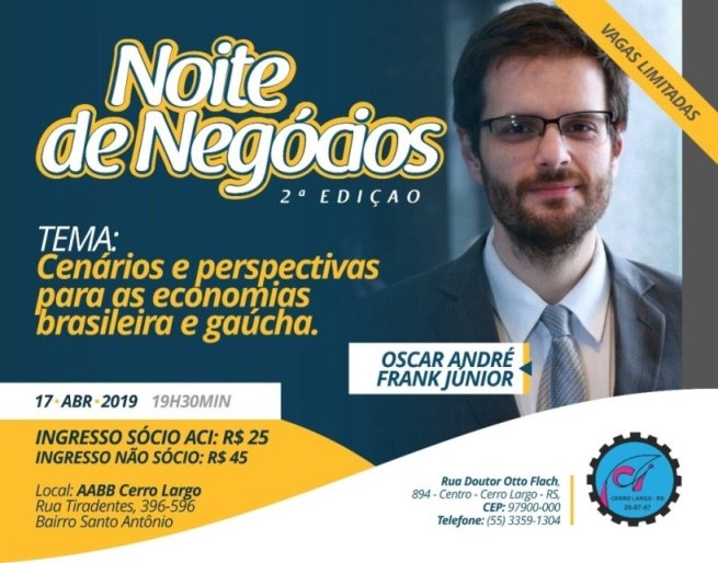 A Associação Comercial, Industrial, Agroindustrial e de Serviços de Cerro Largo (ACI) está convidando associados e comunidade para, no dia 17 de abril, às 19h30min, participarem da 2ª Noite de Negócios, que será realizada na sede da AABB.
