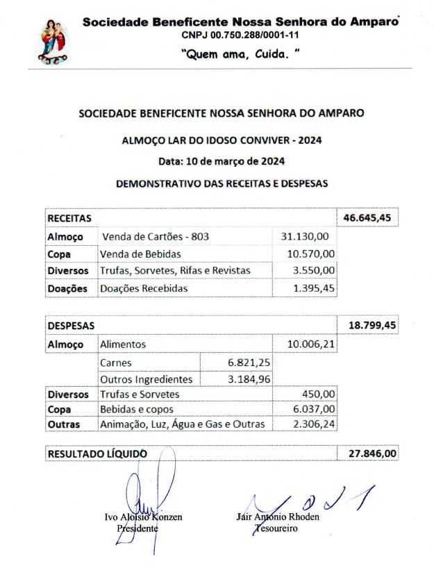 "Nosso reconhecimento e agradecimento às entidades e a todos que prestigiaram o evento", diz Ivo Aloísio Konzen, presidente da Sociedade Beneficente Nossa Senhora do Amparo, mantenedora do Lar do Idoso Conviver.