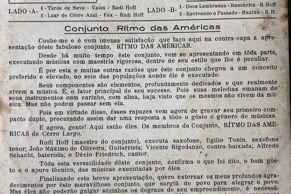 Na foto aparecem os músicos João Máximo de Oliveira, Vicente Rigodanzo, Rudi Hoff, Egílio Tonin, Alfredo Schacht, Juquinha Dahmer e o motorista do conjunto, Egon Bracht.