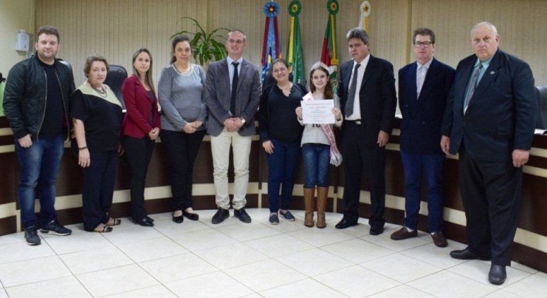Na foto acima, Yasmin e Bianca posam ao lado dos edis Andrei Machado (PP), Marta Schoffen (PP), Cristiane Ribeiro (PP), Vanize Brum (PP), Júnior Frantz (PDT), Paulo Kipper de Almeida (MDB), Lauri Wilchen (PT) e Valdemar José Kunkel (MDB).