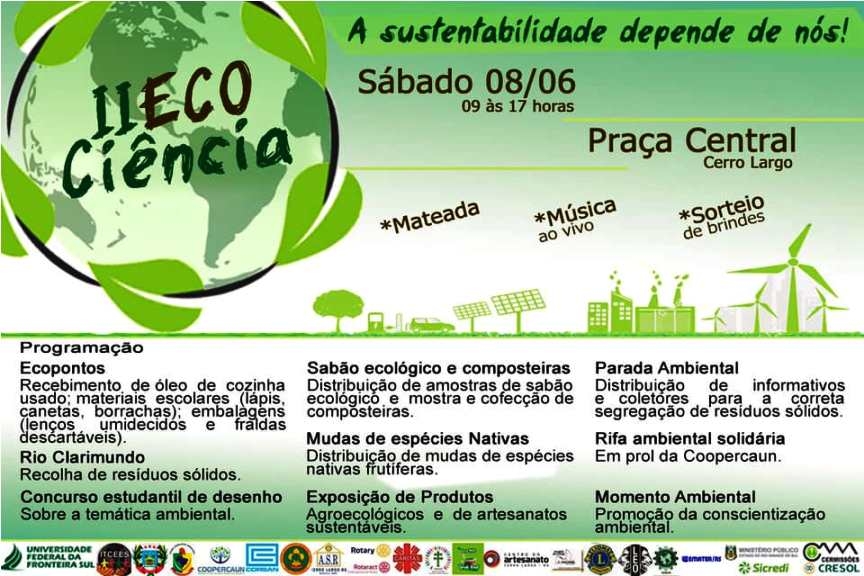 Das 9h às 17h de 8 de junho, na Praça da Matriz de Cerro Largo - em frente à Prefeitura Municipal, realiza-se a segunda edição do Eco Ciência, que tem como lema "A sustentabilidade depende de nós".