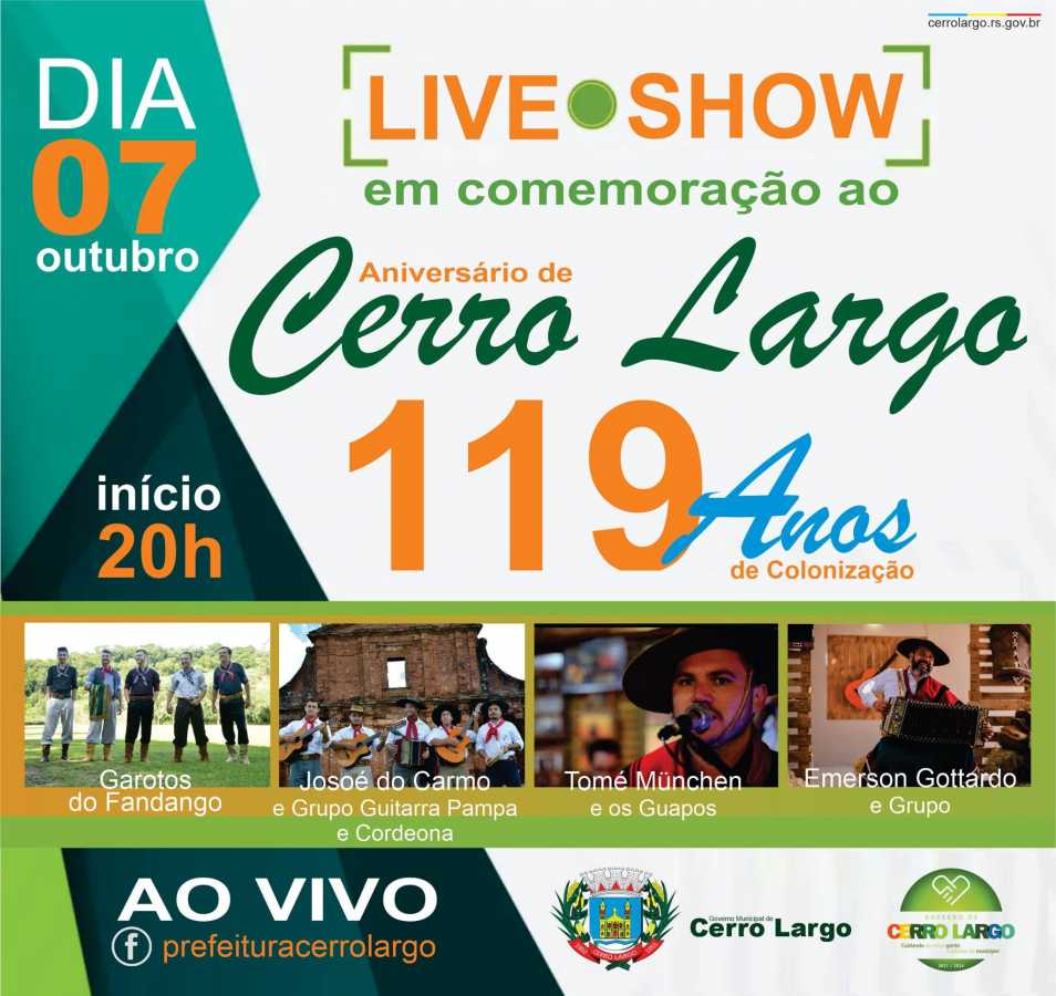 A Live-Show, em comemoração aos 119 anos de dolonização de Cerro Largo, será nesta quinta-feira, dia 7 de outubro, com início às 20h, com transmissão direto da sede do Grupo Folclórico Heimatland, pela página oficial da Prefeitura Municipal de Cerro Largo no Facebook (Acesse AQUI).